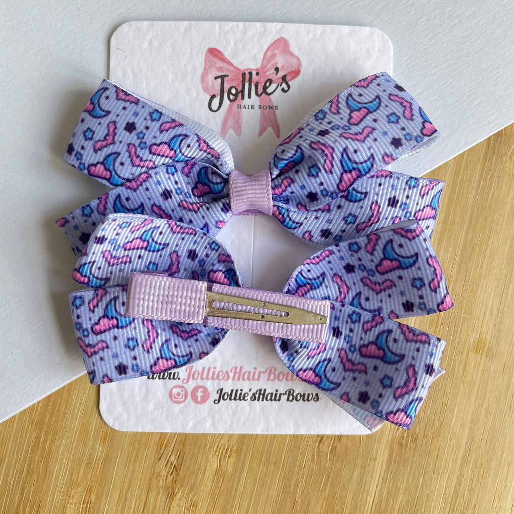 Made from premium grosgrain ribbon in a whimsical lilac bat and moon print, these bows bring a fun and stylish finish to any hairstyle.