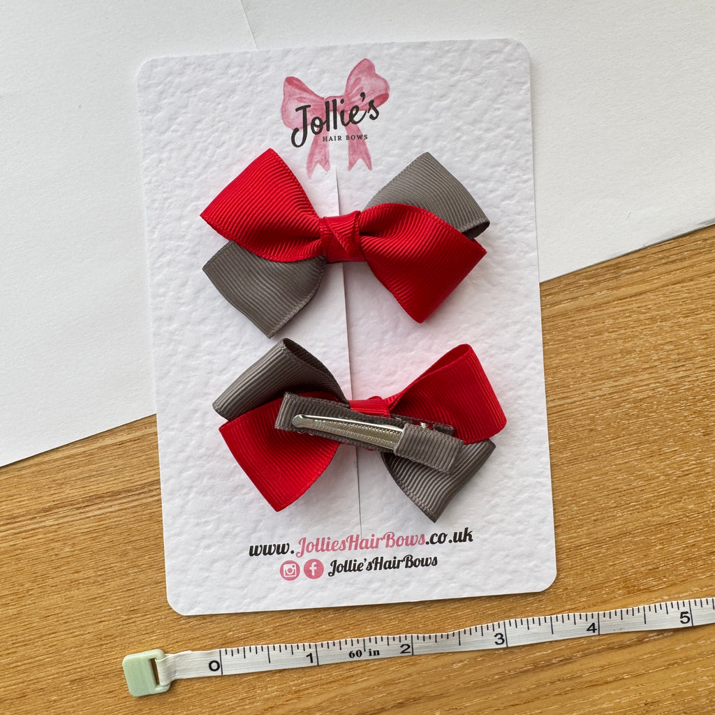 Crafted from premium grosgrain ribbon, these beautifully balanced two-tone bows bring together a bold red and a sleek metal grey for a smart, modern look.