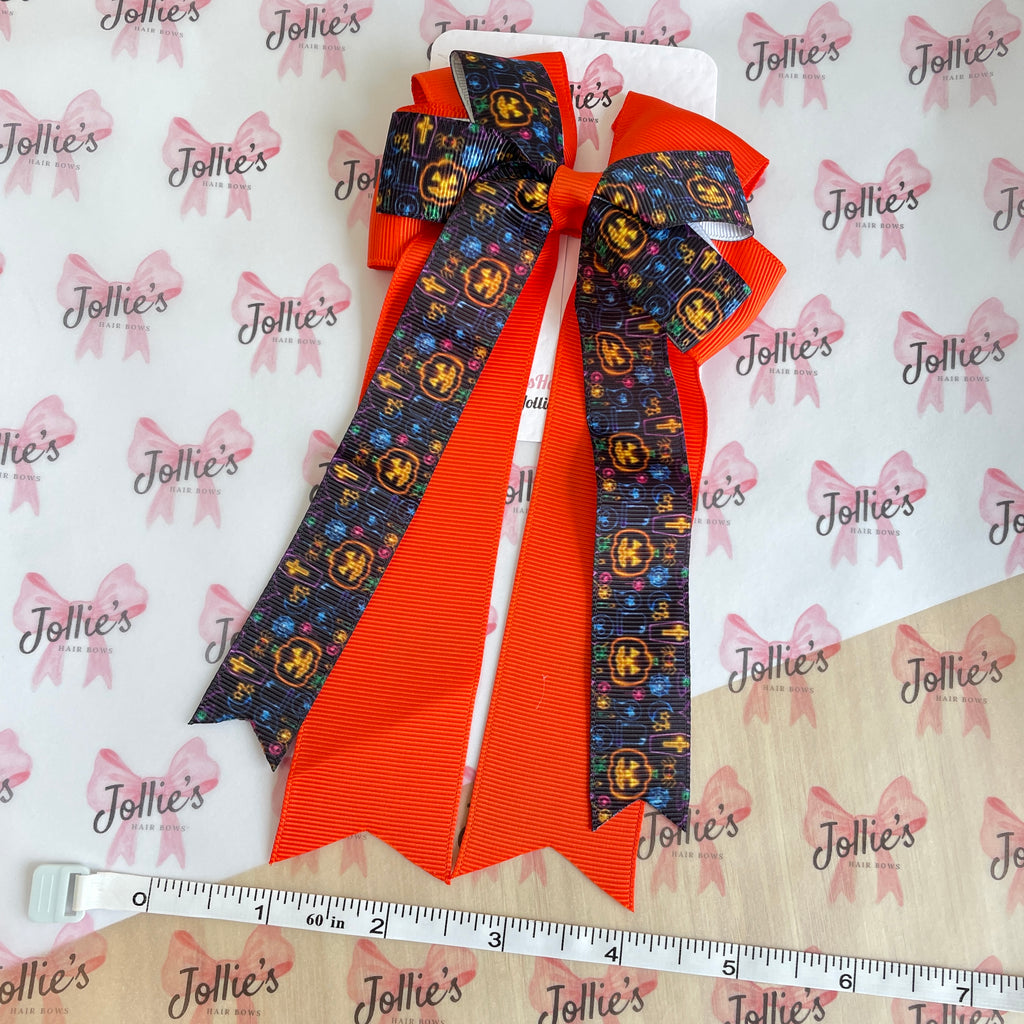 Made from premium grosgrain ribbon in a layered orange and neon pumpkin print design, this bow features long tails for a bold and playful statement.