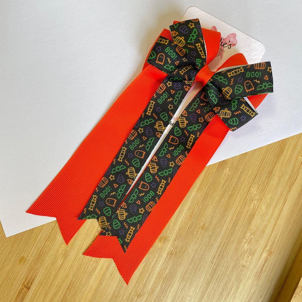 Made from premium grosgrain ribbon in a layered orange and black pumpkin & "Boo" print design, this bow features long tails for a bold and fun statement.